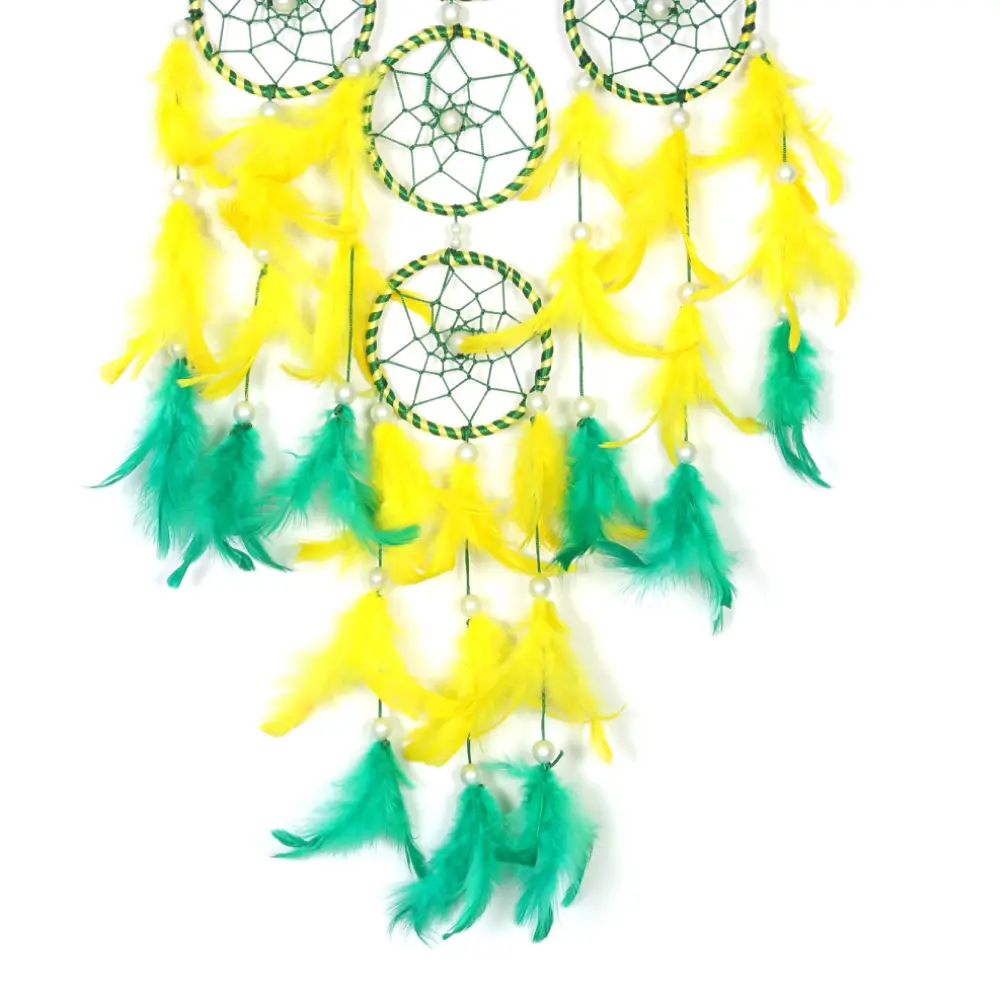 Transform your space with the charm and symbolism of this Dream Catcher featuring 1 big ring and 3 smaller rings, beautifully embellished with vibrant yellow and green feathers.