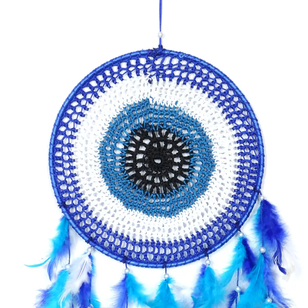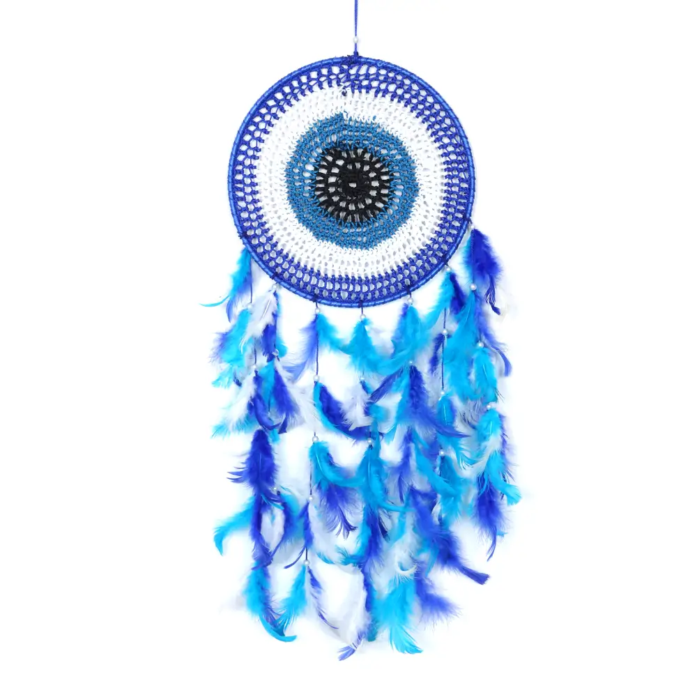 Protect your space with this handcrafted Evil Eye Dream Catcher featuring an 8-inch ring and detailed crosia (crochet) work. Designed with the symbolic evil eye at its center, this dream catcher wards off negative energy and attracts positivity. Ideal for hanging in bedrooms, living rooms, or even in your car, it blends traditional craftsmanship with spiritual meaning to create a beautiful and powerful décor piece.