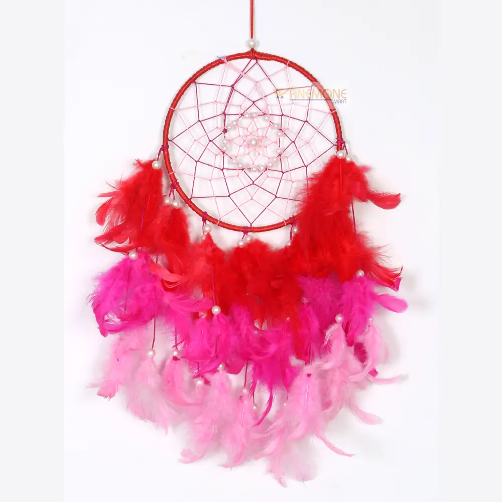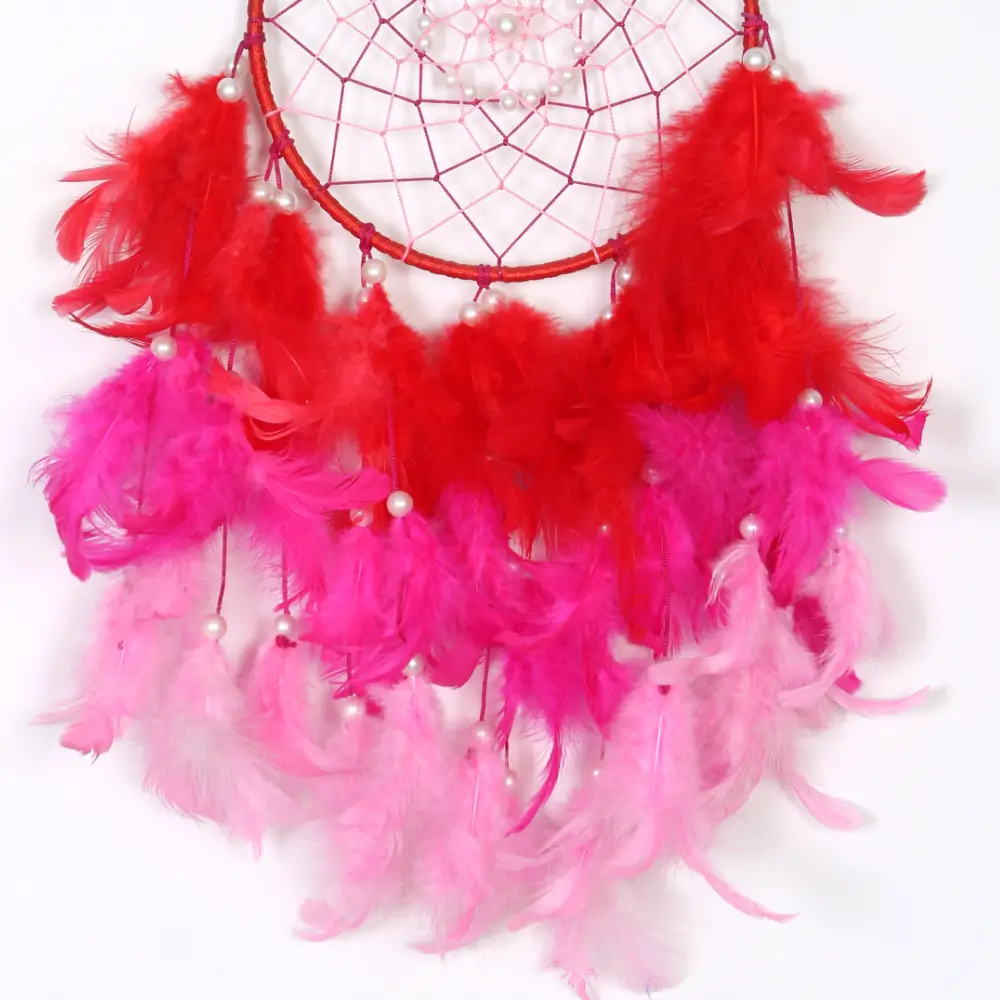 Add a touch of charm and positivity to your decor with this beautiful Single Ring Dream Catcher, adorned with vibrant red, pink, and bright pink feathers.