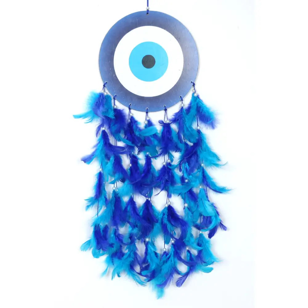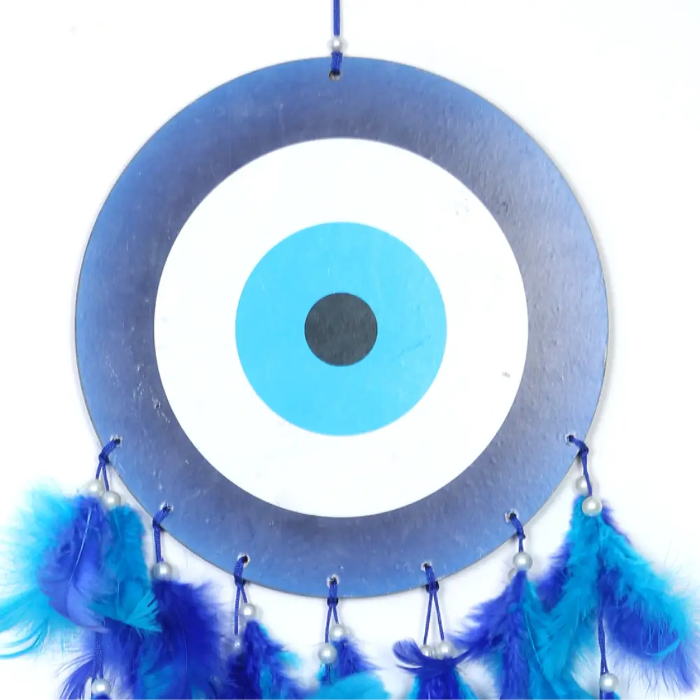 Ward off negative energy and bring good vibes into your space with the ANEMONE MART Dream Catcher featuring an Evil Eye print. This handcrafted piece beautifully blends cultural symbolism with decorative charm. Known for its protective qualities, the evil eye design is paired with soft feathers to create a striking and meaningful wall hanging.